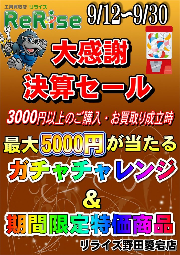 9/12から始まりましたリライズ野田愛宕店の決算イベントも本日9/30を持ちまして終了になります!
