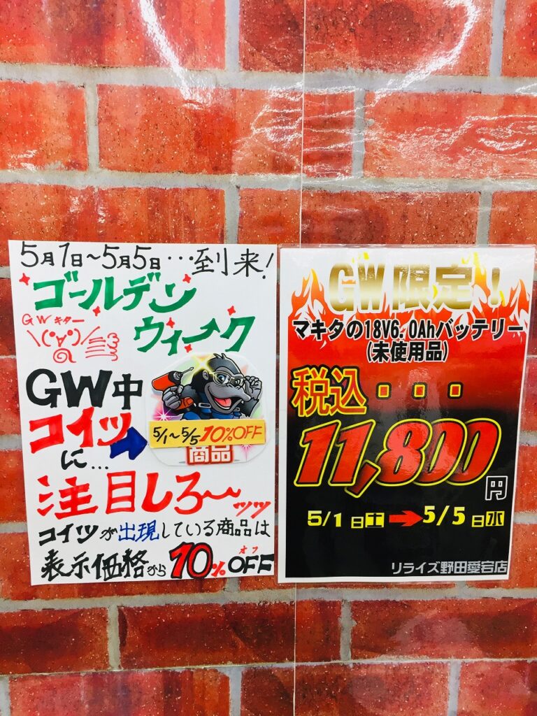 さて、先日もお伝え致しましたがリライズ野田愛宕店ではゴールデンウィーク期間限定の特価商品をご用意しております!
