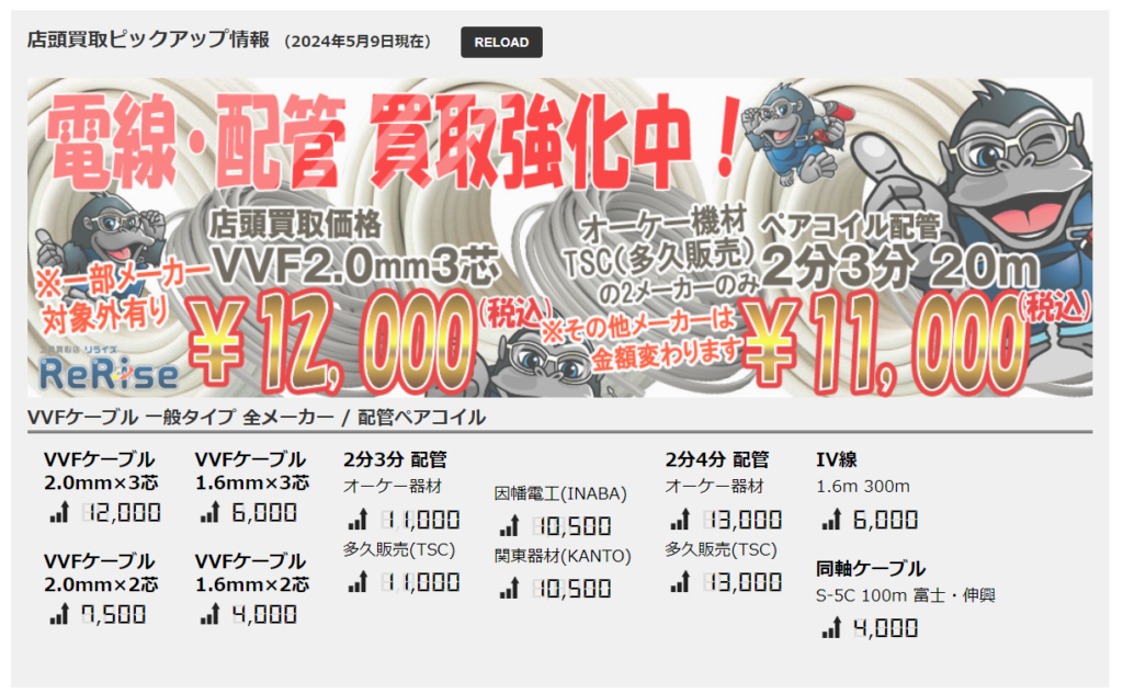 リライズが自信を持ってお届けする電材・配管の現在の買取金額がコチラ↓