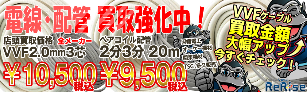 工具の買取・販売に特化した当店では、電材の買取にもかなり力を入れており、特にVVFケーブルやペアコイルといったエアコン工事部材においては、地域一番の買取を目指しております!