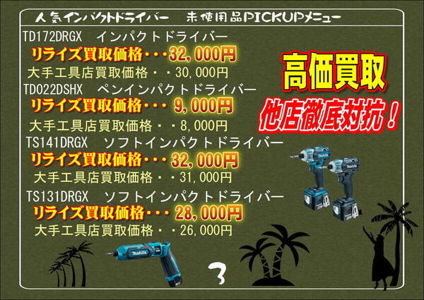 そして今回、未使用品だけでなく、中古の充電式インパクトドライバーも買取強化指定品として、査定額10%アップでお買取りいたします!