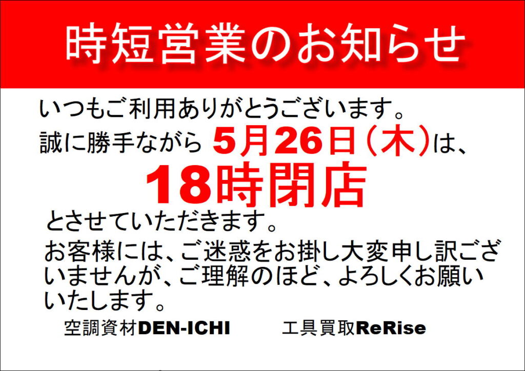 明日の5月26日(木)は、18時閉店とさせていただきます。