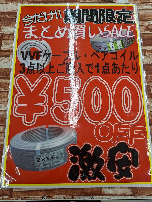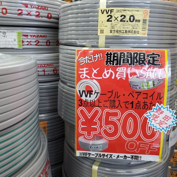 上記写真のペアコイルや電線などがリライズ野田愛宕店にご来店して3点以上買って頂いた方には