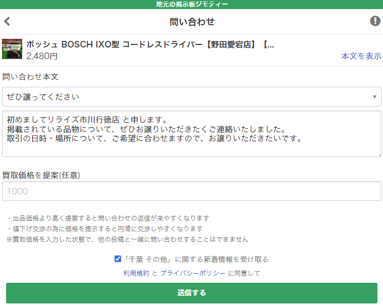 ジモティーでは希望する投稿に問い合わせを入れるところから取引が始まります。