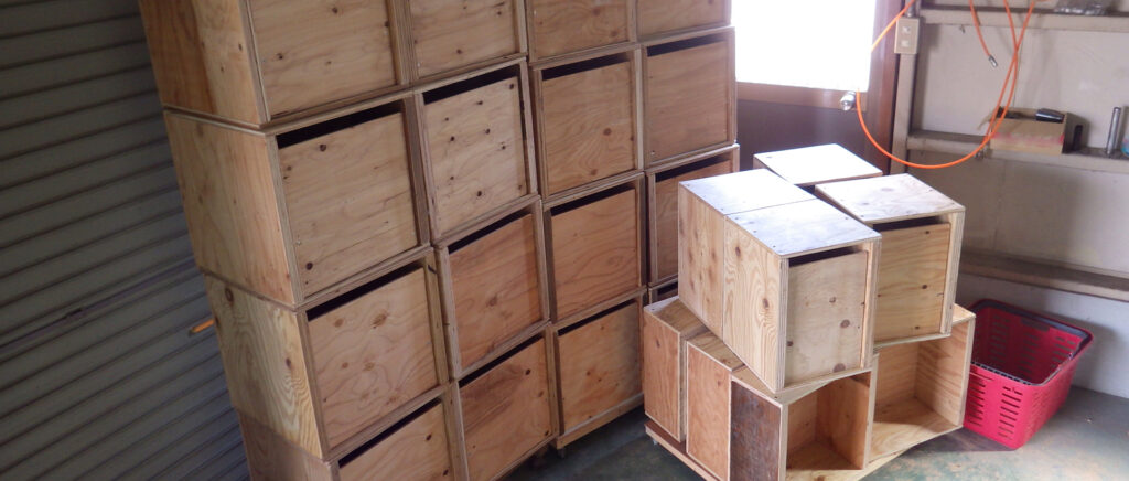 木箱の用途は収納用で、衣類、本、工具などを入れて木製ラックに収める予定です。