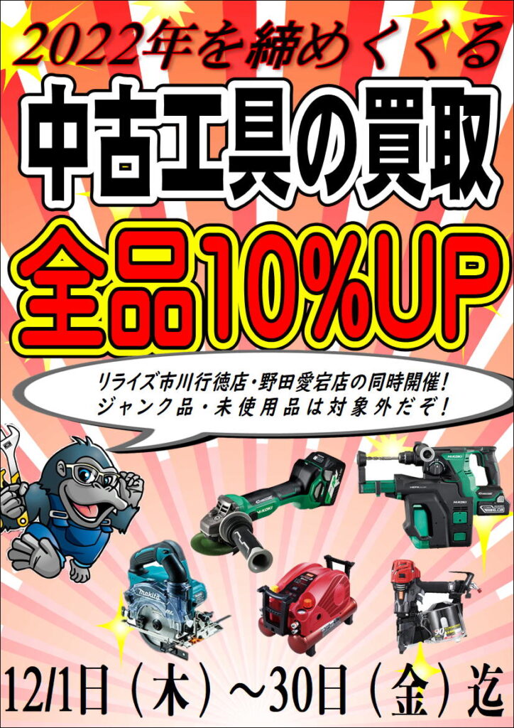 「中古工具お買取り金額10%UP」