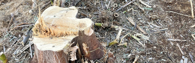 • 切り倒した立木の枝払いをチェーンソーにて作業をしていたが、木根の除根跡に足をとられ、右手で持っていたチェーンソーがはずみで左足膝に当たり傷を負ってしまった。