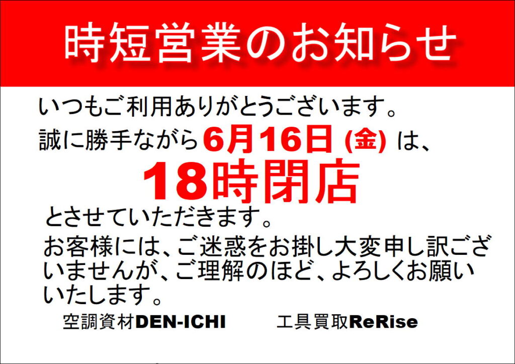 誠に勝手ながら来週の6月16日(金)は、18時閉店とさせていただきます。