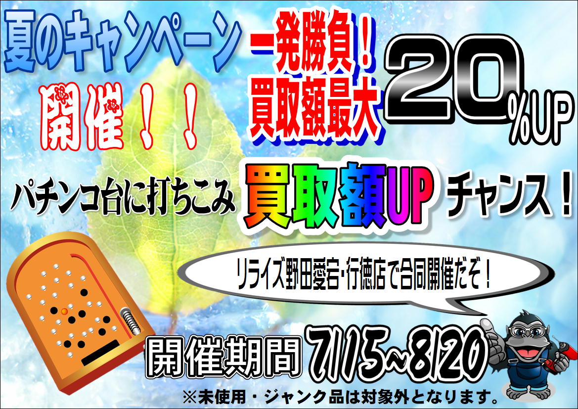 夏休みイベント開始!買取金額最大20%UPのチャンス!期間は7/15(土)~8/20(日)【リライズ野田愛宕店】