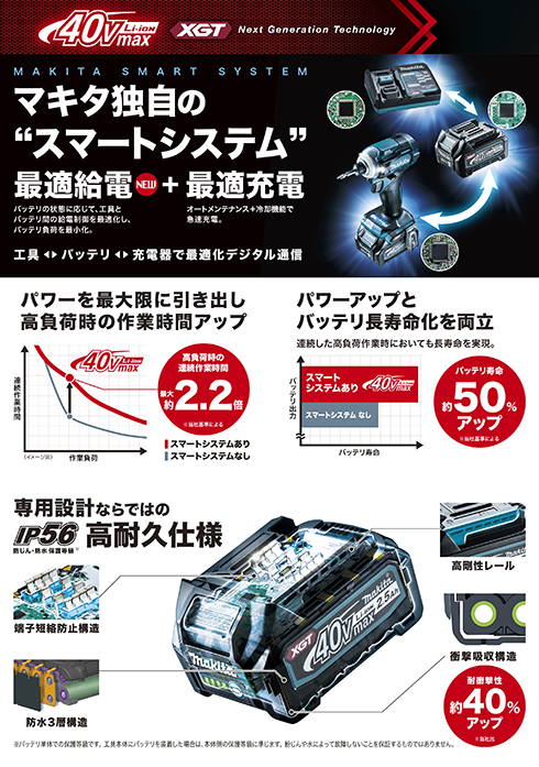 マキタ製独自の「スマートシステム」によりパワーを最大限に引き出す、「IP56」対応&高耐久となっております!