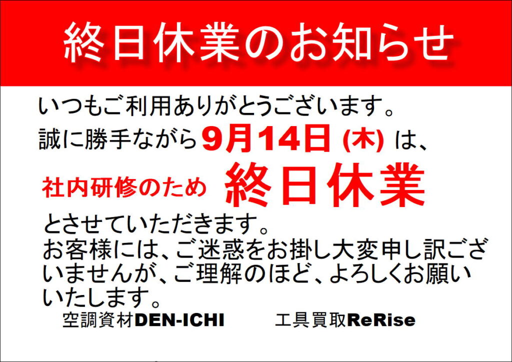 誠に勝手ながら今週の9月14日(木)は、社内研修のため、終日休業とさせていただきます。