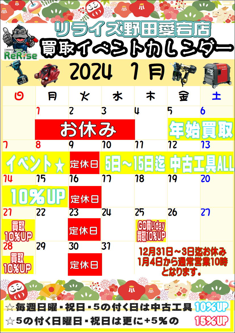 毎週日曜日、5の付く日とは別に5日~15日まで中古工具に限り査定額から全品10%UP週間を開催しまーす(^_-)-☆土日祝休み以外のお客様にもお得にご利用できるスペシャルweekとなりますのでジャンジャン買取お待ちしております!!