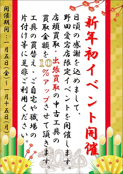 明日1月5日~15日まで開催されるこのイベントは中古工具買取金額10%UP致します!!!