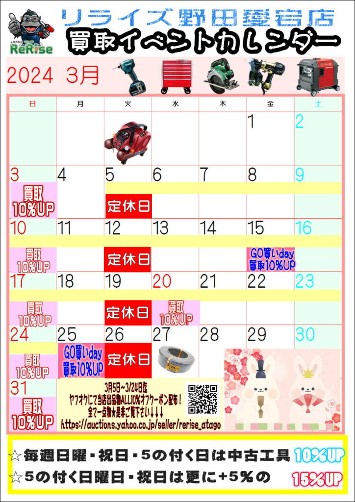 毎週日曜日・祝日・GO買いday(5の付く日)は中古工具ALL10%UPとなります★