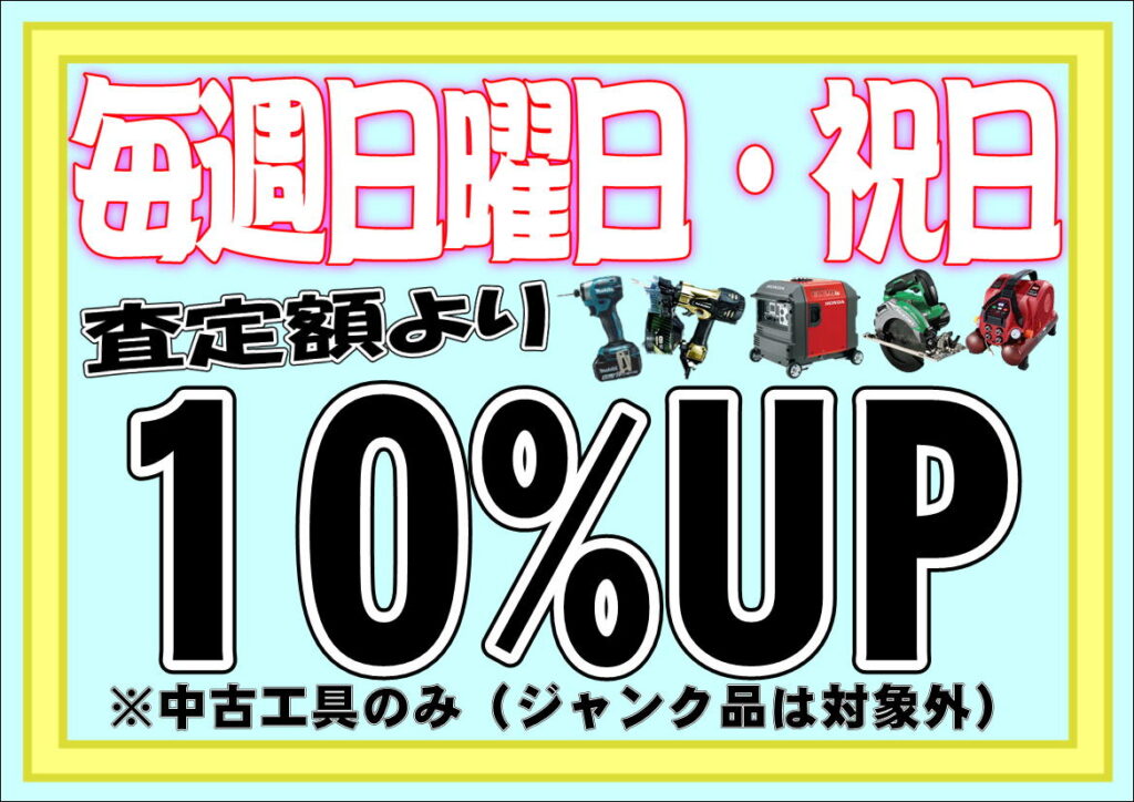日曜日と祝日は中古査定額が10%アップします。毎週チャンスがありますね!