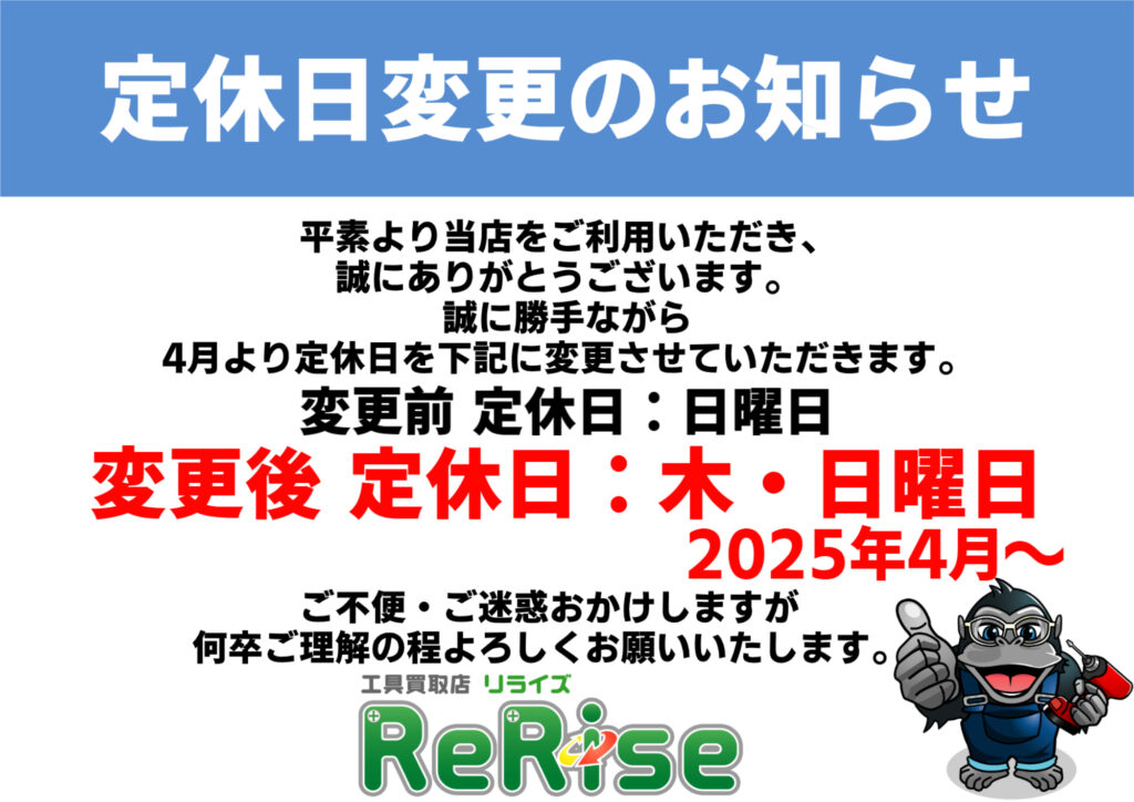 【定休日変更のお知らせ】工具買取店リライズ【市川行徳店】 お知らせ 2025.03.252025.06.20 平素より当店をご利用いただき、誠にありがとうございます。誠に勝手ながら4月より定休日を下記に変更させていただきます。 【変更前 定休日】日曜日【変更後 定休日】木・日曜日 お客様には何かとご迷惑をお掛けすることと存じますが、何卒ご理解いただきますようお願い申し上げます。