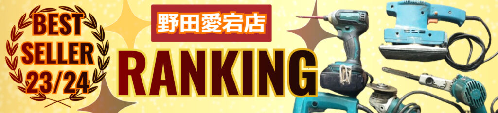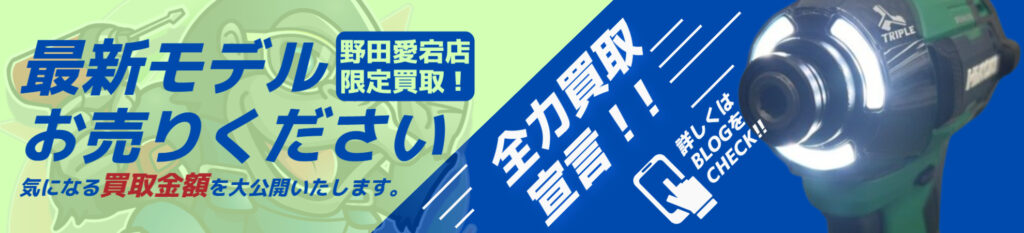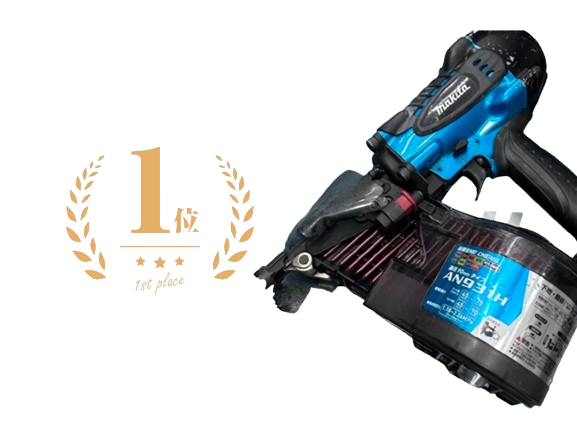 愛宕店アイテムランキング23-24 2024.05.17 エア釘打機 エアツールの中で代表的なエア釘打機。釘を空気の力で材料へ打ち込む、プロ向けの工具です。エアネイラ、ネイルガンなどとも呼ばれます。工具を扱う各社が釘打機を販売していますが、やはりエアー工具ならマックスが特に人気です。 人気のメーカー max/HiKOKI/makita インパクトドライバー 電動工具といえば多くの人の頭に浮かぶのがインパクトドライバー。当店でも最も人気があり数多く販売買取しています。 人気のメーカー makita/Hikoki/Panasonic マルノコ マルノコといえば大変メジャーな電動工具です。プロはもちろん、最近のDIYブームで個人でもマルノコを使う機会は増えている人気のアイテムです。 人気のメーカー makita/Hikoki/Panasonic エアコンプレッサー ハンマードリル レンチ ディスクグラインダー 手動ホイスト 卓上マルノコ