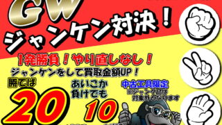 GWイベント開催します!中古工具限定でリライズ市川行徳店のスタッフとジャンケンで勝負し、お買取り金額をUPしましょう!勝ったら20%UP!あいこも負けでも10%UPしますよ!!